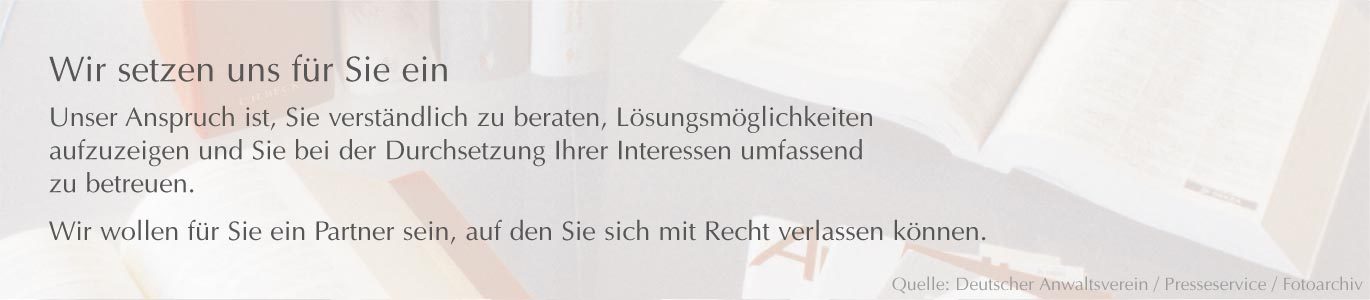 In der Kanzlei Schütz & Kleine steht Ihnen für jedes Rechtsgebiet ein Anwalt zur Verfügung, der sich speziell und kontinuierlich weiterbildet, die aktuelle Rechtsprechung kennt, seine vielfältigen Erfahrungen für Sie einsetzt und Sie kompetent und mit Erfolg vertritt.